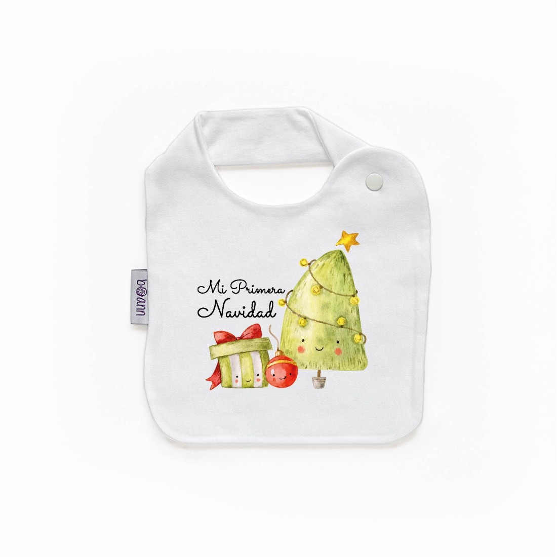 Babero personalizado navideño con la frase "🎄 Mi primera Navidad", fabricado con 3 suaves capas de algodón.