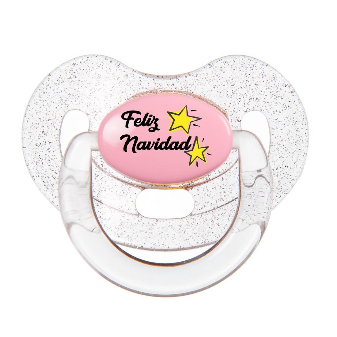 Chupete Navideño a todo color con un diseño original de "Feliz Navidad", disponible con la tentina anatómica en látex o silicona en los tamaños pequeño (0-6 meses) y grande (6-36 meses)