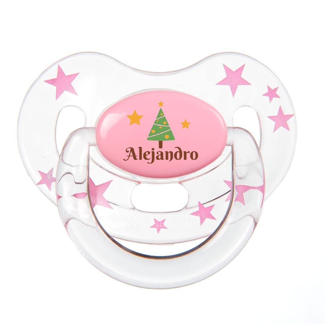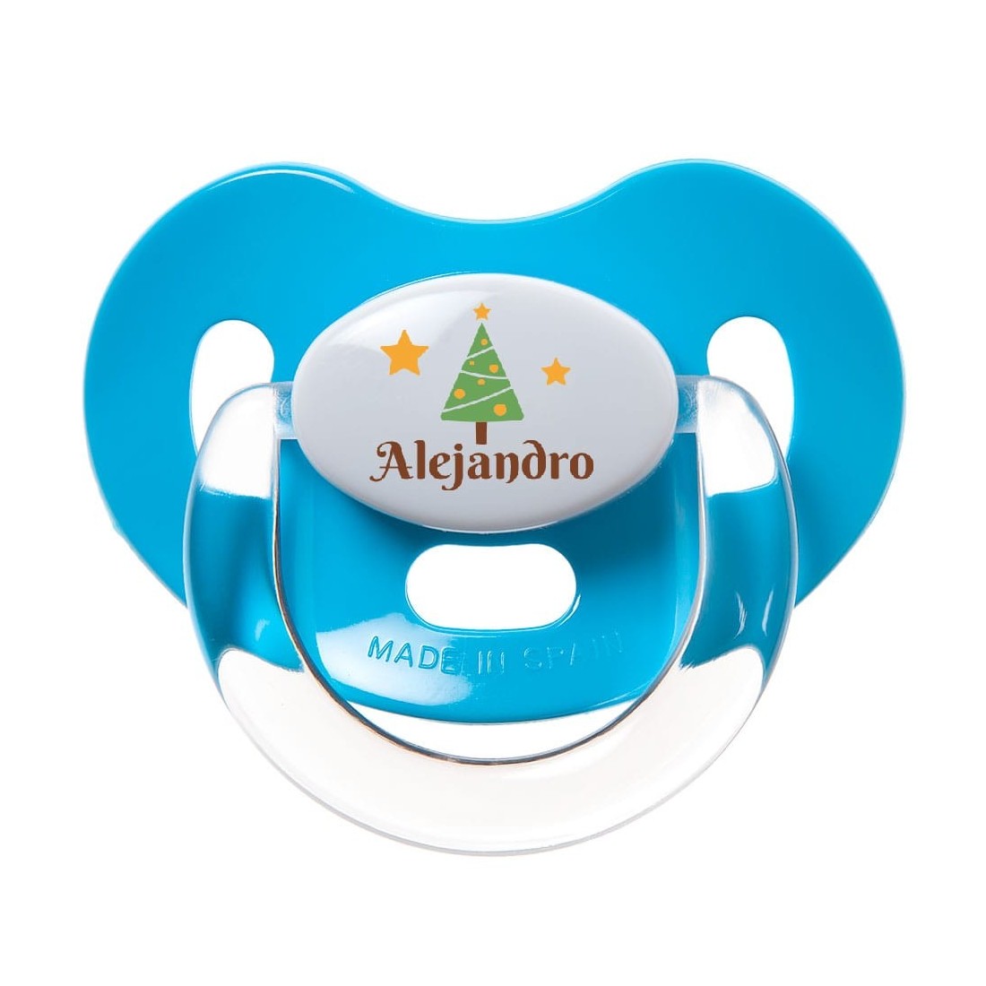 Chupete Navideño con una personalización a todo color del nombre que elijas junto a un simpático y original dibujo de Árbol de Navidad, disponible con la tentina anatómica en látex o silicona en los tamaños pequeño (0-6 meses) y grande (6-36 meses)